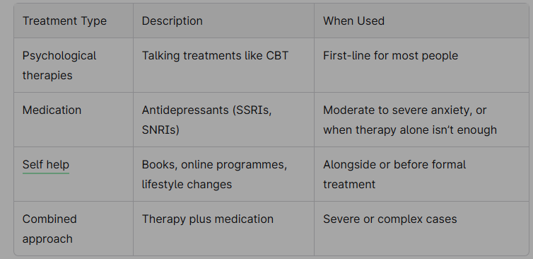 Effective NHS treatments include cognitive behavioural therapy (CBT), other talking therapies, medication, and self help strategies—recovery or good symptom control is realistic for most people.