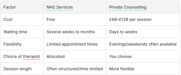 Making the choice: Speak to your GP about NHS options, and contact individual private therapists to discuss fees, availability, and suitability before deciding. Many people find the right path forward by exploring both options.